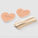 A simple but elegant heart shaped wedding program fan. The titles and the names (and the initials) of the bride and groom are written in an elegant calligraphic script, the rest in caps. The background is peach, the text is terracotta brown. On the back, it has on the left side the wedding ceremony program and, on the right side, the wedding party (with 2 different columns for the bride team and groom team). and under them a short Thank you message.