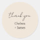 Chic and elegant 'thank you' wedding sticker, featuring couple names in a contemporary set of black fonts against a light peach colour background. This item forms part of a wedding suite containing invitations and stationary in a variety of neutral mix and match items. .
