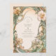 A romantic Art Nouveau wedding design featuring flowing peach and cream florals, interwoven with soft green botanical scrolls. This elegant illustration surrounds a vintage-style layout with graceful curves and ornate detailing, perfect for couples seeking a classic yet artistic wedding aesthetic inspired by nature and antique beauty.