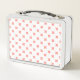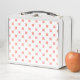 Peach cross stitches on white metal lunch box