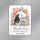 Personalised elegant wedding thank you magnet favours for your guests, featuring a bride and groom gnome couple and a peach floral arch illustration. Edit the card template with a date and the newlyweds' names.