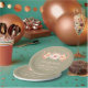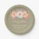 Customisable name baby shower party plates with rustic country burlap pattern and peach and light blush pink watercolor vintage flowers.
