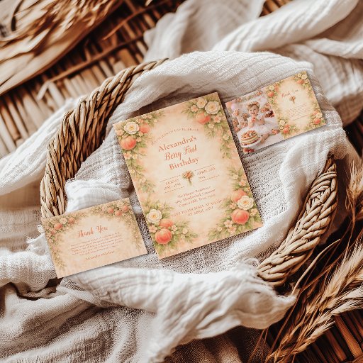 This soft peach berry garden collection features watercolor strawberries, delicate florals, and a warm vintage-inspired palette. The design blends romantic botanical details with a light, airy layout, making it ideal for a sweet and elegant first birthday celebration. Perfect for berry-themed parties with a garden, cottage, or storybook aesthetic, this collection pairs beautifully with coordinating party decor and keepsake details.