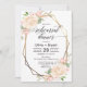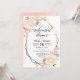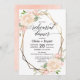 This is a beautiful wedding rehearsal dinner invitation featuring peach watercolor flower and gold geometric frame design.