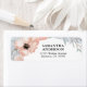 This return address label offers a beautiful watercolor graphic of peach flowers and greenery on a light dusty blue background.