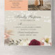 Elegant, bohemian, rustic burgundy floral and peach fuzz all-in-one wedding invitation with monogram, beautiful watercolor flowers in mason jar, string lights and two pictures of the couple. Add your photos, wedding details and rsvp.