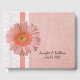 Rustic chic wedding guest book done in a peach coloured burlap look. Graphics of white lace, a satin looking peach coloured ribbon and a big peach Gerber daisy bloom, decorate the left front of the book. Personalise the text fields for your special day.