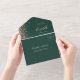 The left-hand edge of this elegant modern all-in-one wedding invitation and RSVP features a peach faux glitter border. The customisable text combines peach whimsical handwriting, copperplate and italic fonts on an emerald green background. The return address appears on the outside flap and the reverse side of the detachable RSVP card in peach text on solid green.