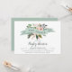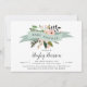 Chic gender neutral baby shower invitation features a sage green ribbon bearing the words "baby shower" with peachy blush pink flowers and green leaves peeking out. Personalise with your baby shower details in inky off black lettering, with the mother to be's name in elegant hand lettered style calligraphy script.