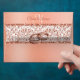 This elegant peach metallic envelope design is perfect for your peach coloured wedding theme. The glitter damask across the flap and the closure is tied together with wedding rings. The flap has the monogram of the bride and groom in elegant script font.