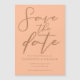 Peach is the new trending colour for summer brides. Our sweet peach wedding Save the Date magnetic card features elegant light brown script for a trendy, minimalist event in the afternoon for a feminine bride who loves to stay current and modern.