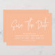 Modern calligraphy wedding save the date in a trendy peach colour with a digital scannable QR code for a website or contact information on the back. Available as a printed card or printable digital download.