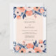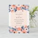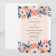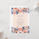 This design features a lush arrangement of peach and blush anemones accented by deep navy blue foliage. The painterly style creates a romantic and vibrant atmosphere, perfect for a seasonal spring event. A soft peach backdrop complements the warm floral tones and contrasting dark leaves. Elegant roses and botanical elements are positioned to create a balanced, nature-inspired aesthetic.