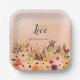 Delightful paper plates for a spring or summer wedding reception with a peach-coloured ombre effect transitioning from a light to a warm peach hue and the text Love in a script font. A colourful garden of watercolor roses, poppies, and greenery. Insert your names and the wedding date.