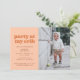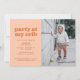 This fun 1st birthday party invitation features the words "party at my crib" in coral on a peach coloured background. It features space for a single photo on the right with space for all of your party details on the left. The back has a colour coordinating coral and peach striped pattern.