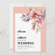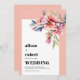 Rhododendron branch with peach pink flowers wedding Invitation. This sophisticated wedding invitation showcases a minimalist white frame adorned with peach pink rhododendron blooms, accented by delicate green foliage nestled in the upper right corner. Soft peach-pink borders frame the design, enhancing its refined elegance, while clean, modern typography in bold strokes adds a sleek, contemporary edge. The reverse features a solid peach-pink backdrop that harmonizes with the front, creating a unified, stylish aesthetic. Every detail—from the floral motif to the crisp text—sweeps together in a celebration of understated luxury, perfect for a romantic wedding announcement.