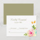 This pretty wedding response card features a watercolor pink and tangerine peach single rose image surrounded by colourful greenery at the right bottom corner. Your custom text is in dark gold at the right. All is placed on an elegant white background. The back of the invitation is gold, matching the text colour. Appropriate for weddings in any season! This card matches invitations and other wedding products in our store.