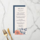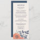 Place these elegant menu cards at each place setting for a beautiful touch to your wedding reception setup. Modern floral design in a chic coral and navy colour palette features watercolor poppy flowers in coral peach, with leaves and buds in dusty navy blue and faded hunter green. Add your names and wedding date to the top. Coordinates with our Peach Poppies wedding invitation collection.