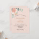 Peach coloured background. Decorated with a rose gold and blush pink floral, rose flower and green watercolored eucalyptus leaves, sprigs, greenery and faux gold sprigs. Personalise and add your names and wedding details.
