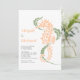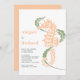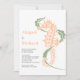 Peach seahorse with sage green seaweed wedding wedding invitation that features a peach seahorse and green seaweed while the names are written in a modern bold typography. This modern whimsical template design is perfect for a summer beach wedding. The back is of solid peach colour.