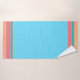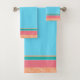 This towel set features tropical poolside colours! A textured peach coloured design border with teal and coral stripe accents make for that exotic beachy feel. Customise the bright blue background to any colour you need. A pale pink is really nice.