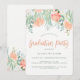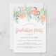 This elegant, watercolor graduation party invitation design features a top border made up of soft peach and white flowers and leaves, all on a white background.