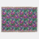 An elegant, colourful peacock and flower pattern in colours of purple, green and pink.