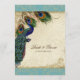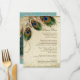 COLOR PALETTE: aqua blue, tan, cream royal blue, green, and rust. DESIGN: Matching Dinner Menu Card. The bride and groom's names and wedding date are on the front of this design. This antique vintage inspired wedding collection has a complete ensemble of products and can be created in several colorways. If you would like it to match your wedding let us know via email and we'll be happy to assist you. This design consists of a stately peacock on a tree branch vintage art element layered three peacock feathers and over an angel etching, swirls, antique handwriting, hand painted lace overlayed on parchment and a beautiful original art damask pattern. The background colour can be changed to match your wedding.