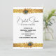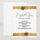 A beautiful golden peacock feather plume rests on top of a solid gold band and has decorative flourish swirls on either side of it. The bands hug the top and bottom edges of the invitation and form a frame around custom black templates. This "save the date" invitation is ideal for any Muslim, Islamic, Hindu, Hindi, Indian; tropical; garden or outdoor bridal shower; wedding; anniversary or event.