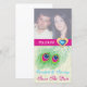 Peacock feather jewel heart wedding Save the Date photo card, featuring an elegant, peacock feather in lime and emerald green, blue, turquoise and fuchsia hot pink, a magenta pink band and an illustration of a sky blue heart jewellery diamond with gold outline and strass on ivory ecru damask background. A modern, stylish design of a classic theme with a light touch of vintage. Note the heart diamond jewel is printed and not a real crystal, so are the strass. This design can be used for other occasions too, such as birthdays, engagements or anniversaries.