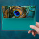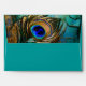 A beautiful faux shimmering peacock feather rests aainst a marbled background. The plume appears to sparkle and shine and the teal envelope makes it pop. This elegant and luxurious design is ideal for any peacock themed event or function.