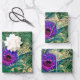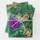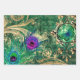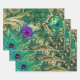 This bright design has vibrant purple and green peacock feathers plus a green and blue butterfly with a green background of gold embellishments and cursive writing. Perfect for decoupage artwork, wrapping gifts, or paper crafts.
