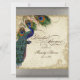 PAPER SELECTION: This is shown on "basic paper", another great choice would be "metallic ice" which is a clean white, pearl shimmery surface. It would also be beautiful on "Champagne Metallic" linen, felt or any of the other choices. COLOR PALETTE: silver metallic, tan, cream royal blue, green, and rust. DESIGN: This antique vintage inspired wedding collection has a complete ensemble of products and can be created in several colorways. If you would like it to match your wedding let us know via email and we'll be happy to assist you. This design consists of a stately peacock on a tree branch vintage art element layered three peacock feathers and over an angel etching, swirls, antique handwriting, hand painted lace overlaid parchment and a beautiful original art damask pattern. The background colour can be changed to match your wedding.