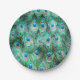 Paper plates with a brightly coloured pattern of exotic and wild peacock feathers in pretty teal, jewel green, aqua and cobalt blue. Artistic and fancy, created with watercolors. A chic and stylish design.