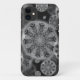 Abstract peacock feathers glowing kaleidoscopes in shades of grey over black grainy background