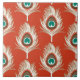 Ceramic tile in a peacock feather textile print, executed in Adobe Illustrator an Photoshop - creamy white feathers, with an eye in shades of coral orange, chocolate brown, and turquoise, on a deep mandarin orange background