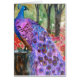 Looking for an exotic peacock? in this peacock art, a purple & sapphire blue peacock sits on a wooden tree stump in a gorgeous meadow filled with coral & pink wild flowers. Peacock's feathers are shades of phlox and orchid with many browns to complement the rich colours. The background also has barren brown trees with lush cedar greens and bamboo yellows beyond. Designed by watercolor artist Miriam Schulman