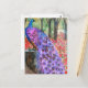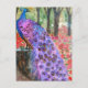 Looking for an exotic peacock? in this peacock art, a purple & sapphire blue peacock sits on a wooden tree stump in a gorgeous meadow filled with coral & pink wild flowers. Peacock's feathers are shades of phlox and orchid with many browns to complement the rich colours. The background also has barren brown trees with lush cedar greens and bamboo yellows beyond. Designed by watercolor artist Miriam Schulman