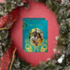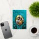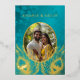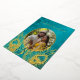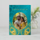 This elegant wedding invitation features a round photo surrounded by real gold foil peacock feathers on a shimmering floral turquoise background.