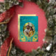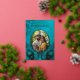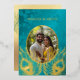 This elegant wedding invitation features a round photo surrounded by real gold foil peacock feathers on a shimmering floral turquoise background.