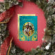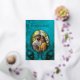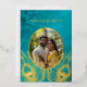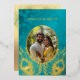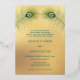 This elegant wedding invitation features a round photo surrounded by real gold foil peacock feathers on a shimmering floral turquoise background.