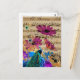 A beautiful teal and blue peacock sits on top of purple and blue flowers with a tan sheet music background.