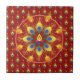 Pattern behind the Rangoli: single peacock's feather with little Diya lamps on crimson red background.