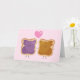 Peanut butter and jelly love greeting card - peanut butter and jelly on bread, holding hands with a big pink heart above them.