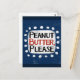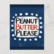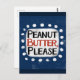 "Peanut Butter, Please" is a cute text design in blue with black and red text, along with a white accent shape and white textured whimsical dots surrounding it.