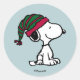 This circular, classic Peanuts sticker features a simple, sweet illustration of Snoopy, the beloved beagle. Snoopy is sitting up with a contented, smiling expression. He is wearing a long, festive Christmas sleeping cap or beanie that is striped in red and green with a matching red cuff. The hat has a tassel hanging down, giving it a playful, holiday feel. The illustration is set against a soft, pale blue background. This officially licensed sticker is ideal for holiday mail, Christmas gifts, or adding a touch of seasonal cheer to your belongings, perfect for fans of the Peanuts gang and classic holiday themes.