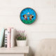 The size of the clock is dramatic and the abstract alcohol ink design is soothing and intricate at the same time. I chose the black frame that adds pop to the blue and gold design. The gold printing would be better in a slightly darker or larger font. I love it and I’m looking for just the right place in ny new apartment. I would recommend this clock for a personal gift or a present. I feel that the quality is excellent for the money! I’m a bit of a clock nut so I’m pretty particular about my purchases. The clock is larger in diameter than many if the clocks I have, so it stands out very well. I think a slightly darker printing color and a moderately larger size would best suit a professional decor or add more impact in a work place item.