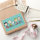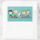Check out Lucy, Charlie Brown, Snoopy, Sally, and Linus sitting together in a row.