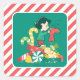 This square Peanuts sticker features a festive scene with a diagonal red and white striped border. The central image, set against a green background, shows Lucy van Pelt surrounded by an overflowing pile of holiday sweets and treats, including a large candy cane, peppermints, and various candies. Lucy is holding a red sock or small item to her mouth. This officially licensed sticker is a vibrant and cheerful piece of seasonal merchandise, perfect for decorating holiday gifts, sealing envelopes, or adding a touch of classic Christmas charm to any item.