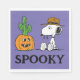 Spike, with his signature droopy moustache and thin frame, wears a slightly worn-out hat that adds to his desert-dweller charm. The jack-o'-lantern has a crooked smile, with uneven teeth and triangle-shaped eyes, looking mischievously spooky. The cactus stands tall behind the pumpkin, adding a bit of that desert flair to the scene, almost like it's a part of the Halloween celebration itself.